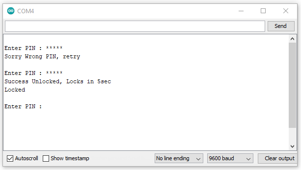 #include <Keypad.h> #include <LiquidCrystal_I2C.h> LiquidCrystal_I2C lcd(0x27, 16, 2); const byte ROWS = 4; const byte COLS = 4; char keys[ROWS][COLS] = { {'1', '2', '3', 'A'}, {'4', '5', '6', 'B'}, {'7', '8', '9', 'C'}, {'*', '0', '#', 'D'} }; byte rowPins[ROWS] = {2, 3, 4, 5}; byte colPins[COLS] = {6, 7, 8, 9}; Keypad keypad = Keypad( makeKeymap(keys), rowPins, colPins, ROWS, COLS ); const int pinlength = 5; int i = 0, pin_match = 0; char pin_number[pinlength] = "12345"; void setup() { lcd.init(); lcd.backlight(); reset(); } void loop() { char key = keypad.getKey(); if (key) { lcd.print("*"); i++; int i_key = i - 1; if (pin_number[i_key] == key) { pin_match++; } if (pin_match == pinlength) { unlock(); } else if (i_key >= (pinlength - 1)) { wrong_pin_number(); } } } void lock() { /* Code for Any other operations. */ } void unlock() { lcd.clear(); lcd.setCursor(3, 0); lcd.print("Unlocked"); lcd.setCursor(0, 1); lcd.print("Press D to Lock"); /* Code for Any other operations. */ while (1) { char lock_key = keypad.getKey(); if (lock_key == 'D') { lock(); break; } delay(50); } reset(); } void wrong_pin_number() { lcd.clear(); lcd.setCursor(3, 0); lcd.print("Wrong PIN"); /* Code for any other operations. */ delay(2000); reset(); } void reset() { pin_match = 0; i = 0; lcd.clear(); lcd.setCursor(3, 0); lcd.print("Enter PIN"); lcd.setCursor(1, 1); /* Code for any other operations. */ }